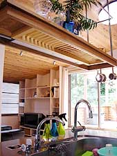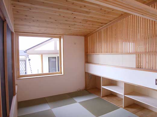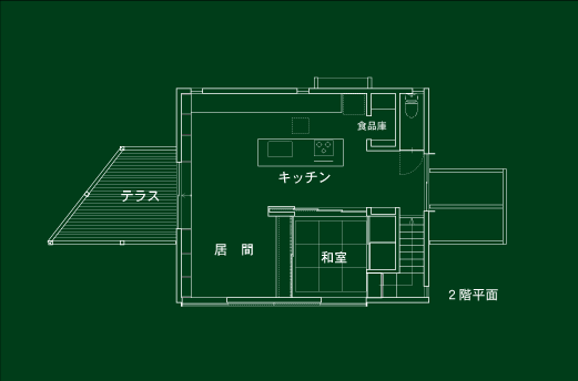 2階の中心にはキッチンがあり、ここからは和室に寝ている子供の様子をうかがえ、リビングとつながるテラスまで見渡せるようになっています。 |