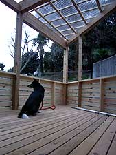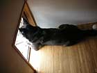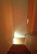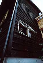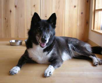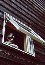 | 玄関横の階段踊場の窓から、まず愛犬ボニータが来客者を出向かえてくれます。ここはボニーの定番位置です。 |